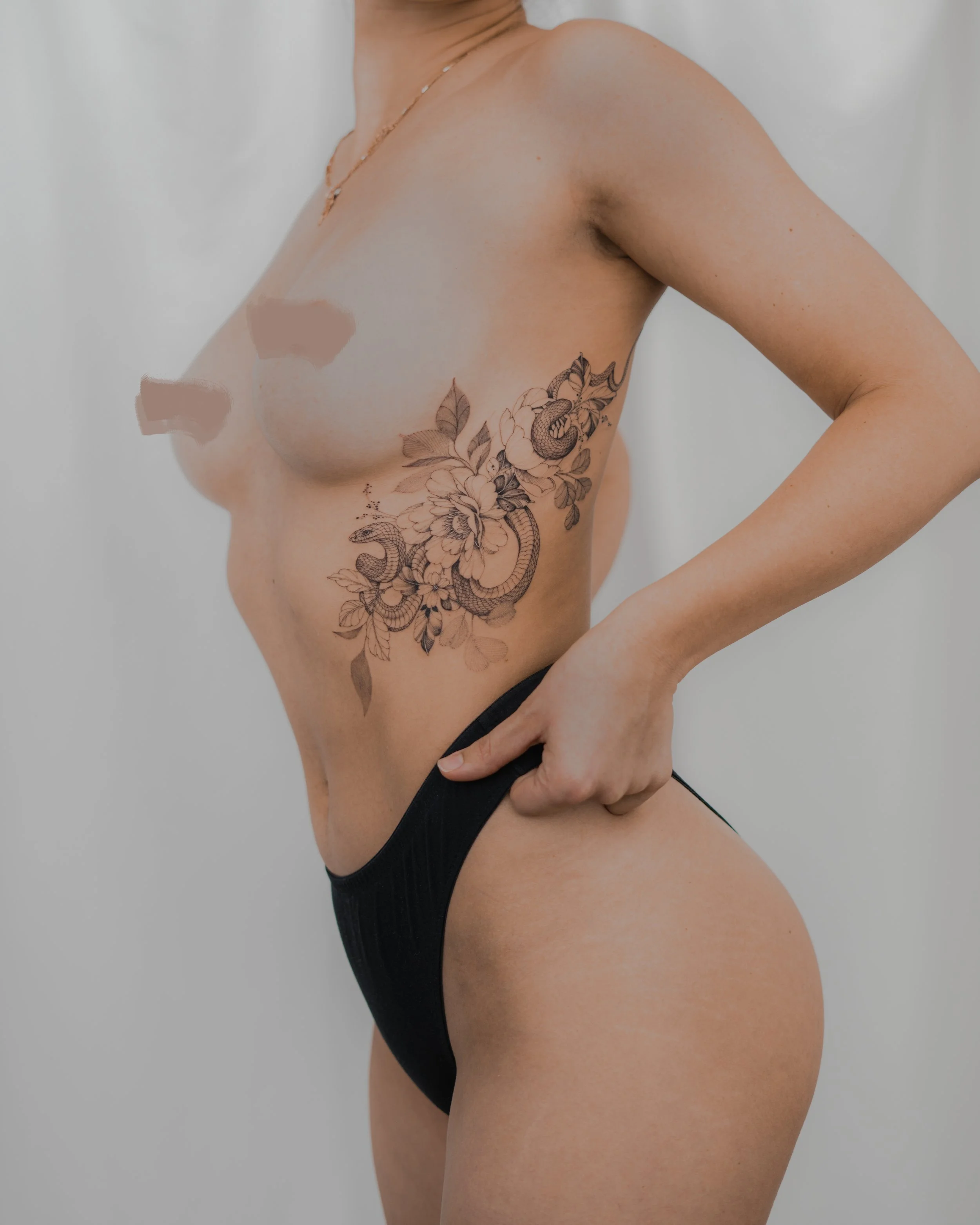 His work is focused on floral pieces with the intention of accentuating the flow and natural curvature of the body. Each piece is meticulously drawn directly on the skin with a great consideration of the person’s build. Thus, it makes every piece unique for each individual.